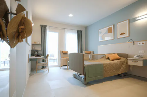Le camere sia singole che doppie, sono ampie e luminose, tutte ben arredate e dotate di TV e bagno privato in camera, dispongono di campanello per le chiamate di emergenza e dei gas medicali. Ogni residente può personalizzare la propria camera con piccoli complementi d’arredo, quadri o altri oggetti. La privacy del residente viene rispettata sia nella progettazione degli spazi comuni che nella discrezione del personale.