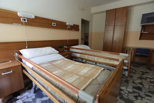 Le stanze dei piani sono dotate di letti a due snodi con testa letto attrezzato di illuminazione, campanello di emergenza e presa telefonica. Gli arredi delle stanze sono composti da armadio e comodino per ciascun paziente oltre ad un tavolo con sedia ed un televisore.
